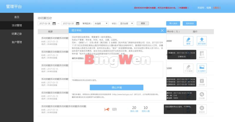 系统通过功虎社区、微媒网络的用户授权登录,完成小微企业的帐号绑定、企业实名认证等,系统分为杭州市科技创新创业服务中心管理模块和服务商管理模块,服务商进入双创活动管理平台后,按备案要求完善服务机构信息,经过系统审核通过后,发布活动信息,小微企业在线完成活动报名、打卡等操作,最后由服务中心进行考核。