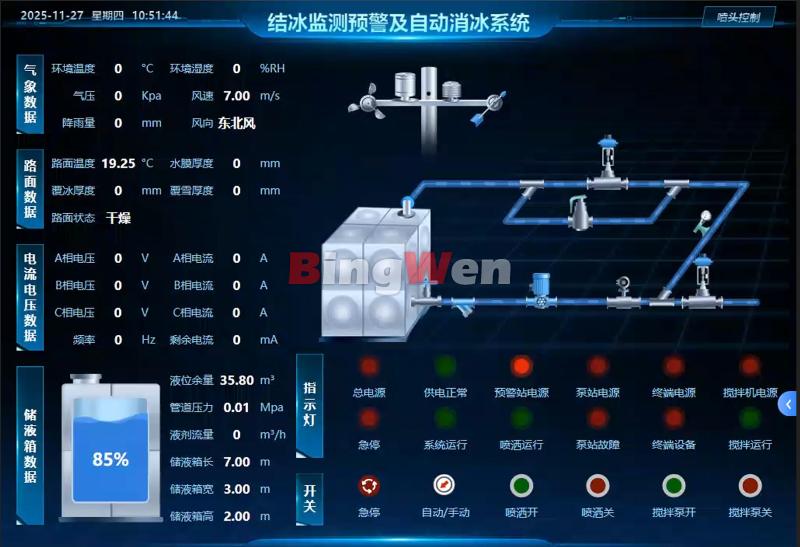 结冰监测预警及自动消冰系统是通过道路遥感传感器自动检测路面状态和相关气象信息, 将检测数据传输到控制系统,同时通过视频监控系统,实时监控桥面路面的温度情况。冬季,一旦路面温度快接近结冰临界点时,传感器会自动感应路面温度情况,然后将数据传至路段监控中心,数据库根据雪情、湿度和温度状态, 经过数据处理计算得出道路结冰时间和冰层厚度,控制系统就会发出预警预报信息,并通过远程指令,控制安装在安全护栏上的喷嘴自动喷洒环保型液态融雪液,从而达到防、除冰雪目的,最大程度地降低冰雪灾害对道路交通安全的影响,避免重大交通事故发生,有效保障道路的安全畅通。